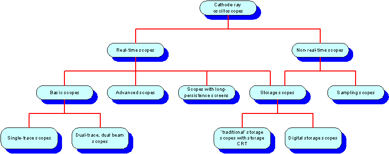This type of oscilloscope is known as a ‘real-time’ oscilloscope. This means that the vertical deflection of the spot on the screen at any instant is determined by the Y input voltage at that instant. Not all CRT oscilloscope are real-time instruments, figure 3.1b categorises the various types available.