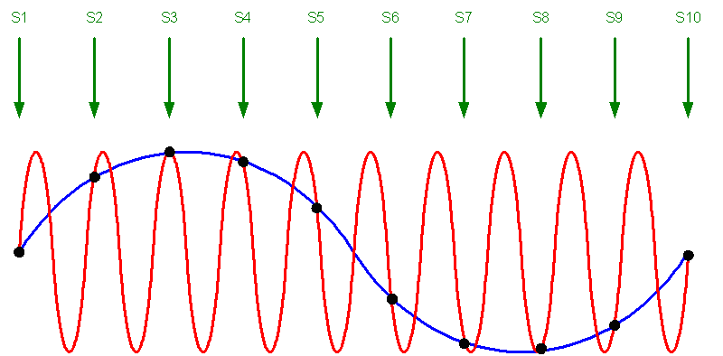 Many samples should be taken per cycle (at least 10 for pulse interpolation) to ensure an accurate representation of an analogue signal in a digital memory. If only one sample is taken per cycle, or one sample per several cycles, then aliasing occurs. For example say a waveform is being sampled every three cycles, these samples may form together, particularly when using pulse interpolation, to look like a valid waveform.