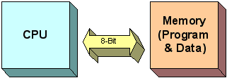 The traditional Von-Neumann Architecture (Used in: 80X86, 8051, 6800, 68000, etc…) is illustrated in Figure 3.5a. Data and program memory share the same memory and must be the same width.