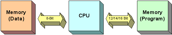 PICs use the Harvard architecture. The Harvard architecture (Figure 3.5b) is an adaptation of the standard von Neumann structure with separate program and data memory: data memory is made up by a small number of 8-bit registers and program memory is 12 to 16-bits wide EPROM, FLASH or ROM.