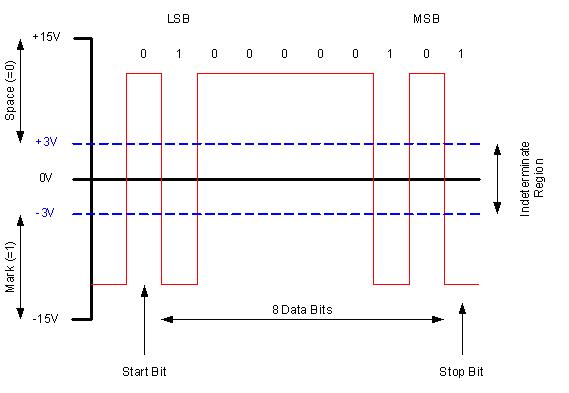 The output signal level usually swings between +15V and -15V. The ‘dead area’ between +3v and -3v is designed to give some noise immunity. This dead area can vary for various RS232 like definitions, for example the definition for V.10 has a noise margin from +0.3V to -0.3V. Many receivers designed for RS232 are sensitive to differentials of 1v or less.