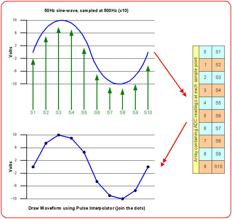 Digital sampling oscilloscopes use an ADC (analogue-to-digital converter) to converter analogue voltages to binary representation. The sampling rate specifies the number of samples taken per second. Figure 3.2a demonstrates clearly how an analogue wave-form is digitally sampled and displayed onto the screen (LCD, Computer Monitor, etc…).