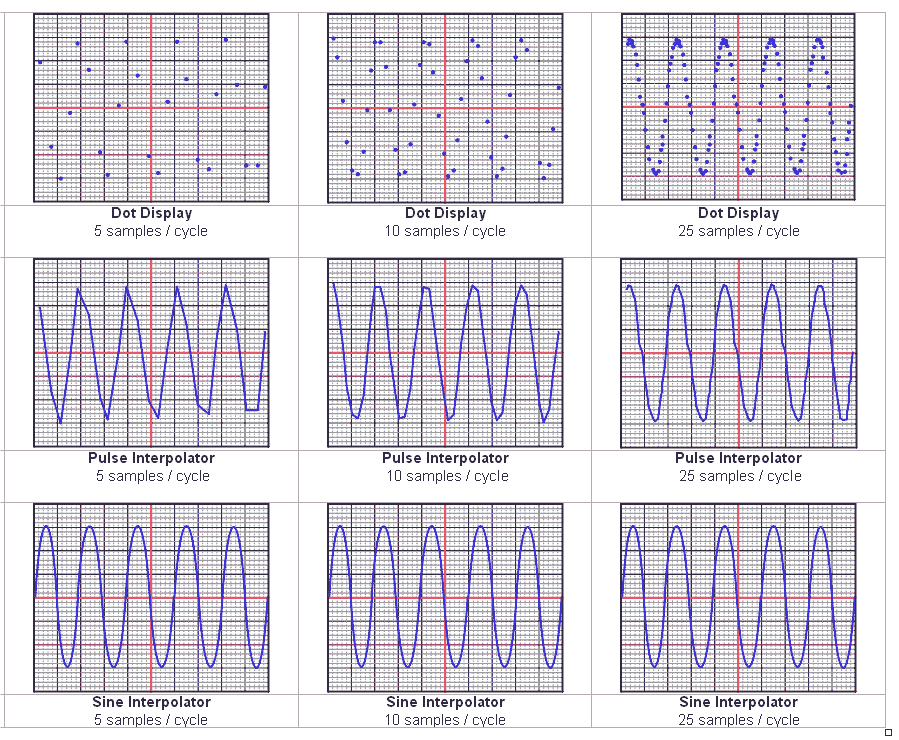 Nyquist theorem states that “to define a sine wave, a sampling system must take more than two samples per cycle”. Notice that the sine interpolator display type (2.5 samples / cycle) approaches the limits that the sampling theory suggests.