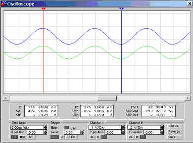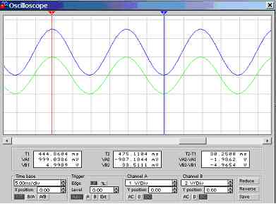 Figure 5.3.1a. Screen dump of oscilloscope (CH A: Input, CH B: Output) |