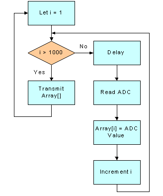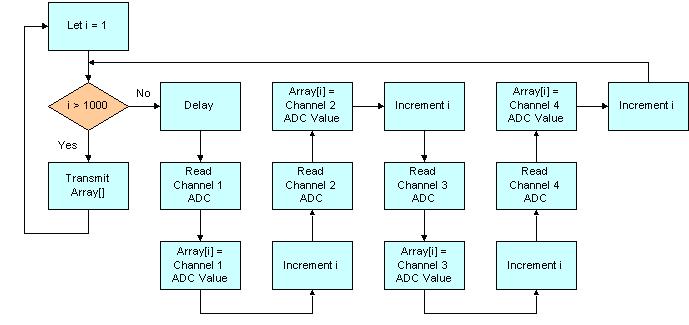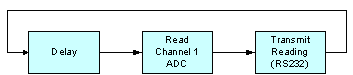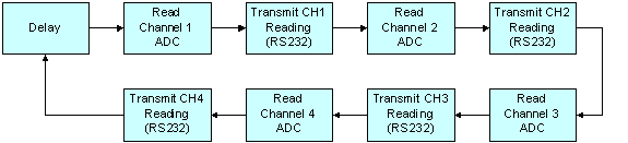 Reads one sample at a time sending each reading directly to the PC using RS232, note there is a delay (real-time clock) between readings which is specified by the PC using the ‘control’ protocol.