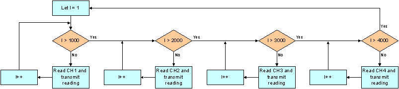 1b. Illustration of real-time mode with four channels (chop mode)Figure 6.1c illustrates sampling four channels in the real-time mode using alternate sampling. Channel 1 is sampled 1000-times, then channel 2 is sampled 1000-times, then channel 3 is sampled 1000-times, then channel 4 is sampled 1000-times and the process repeats forever.