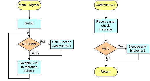 The PIC checks the UART buffer regularly (or UART interrupt) checking to see if a control message is being received. Once a control message has been detected, the PIC leaves the main program and checks (CRC check) that the message is valid, if not return to the main program, if valid decode and implement the message. This process is illustrated in figure 6.3a.