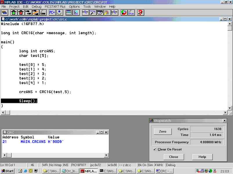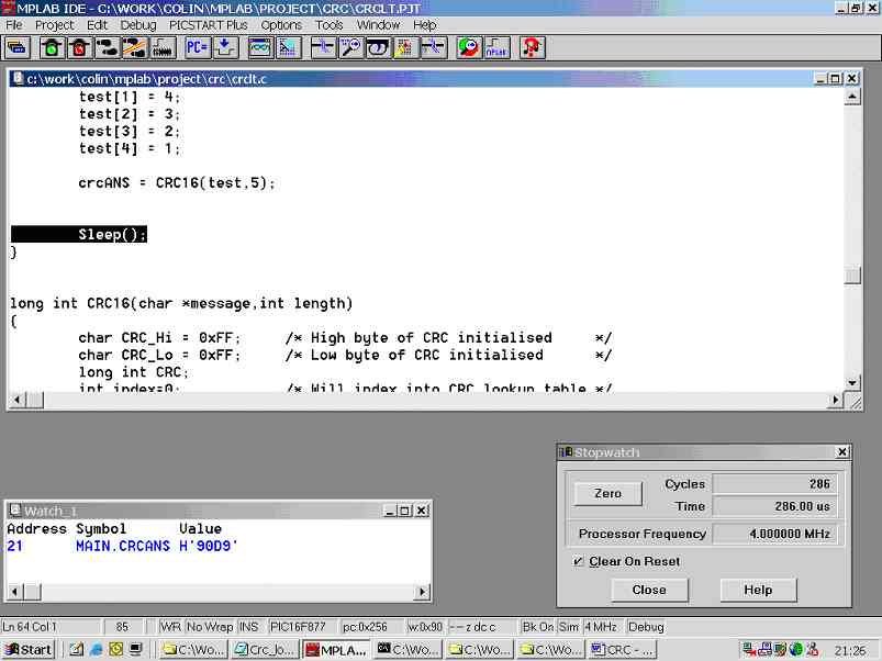 Test array setup containing 5 elements, the test array is then send to the CRC function which then calculates the 16-bit CRC for the test array. Break point was inserted at the position of the Sleep () command, the stopwatch windows was opened and reset. Program was then simulated (stopwatch starts) until the break point is reached (stopwatch stops). Note the stopwatch time is the total time taken to execute all instructions in the test program and not just the CRC16 function. This is fine as the two test programs are identical except for the CRC16 function, therefore a good comparison can be made.
