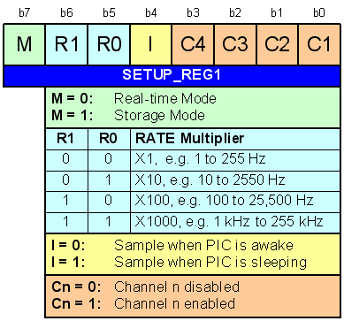 SETUP_REG1 is shown in figure 6.9b, this register specifies real-time/storage mode, sample rate multiplier, sample awake/sleeping and which channels are enabled / disabled. Note sampling when the PIC is sleeping is only an option for very slow sample rates as it takes a long time for the PIC to return to full speed after waking up. Recall that sampling when the PIC is sleeping results in more accurate ADC readings (less noise)