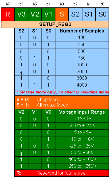 SETUP_REG2 is shown in figure 6.9c, this register specifies the number of samples to be stored into RAM (storage mode only), chop or alternate mode and the voltage input range (change gain of op-amps). Notice that b7 is marked as ‘R’, this means that the bit is not used and is reserved for future use.