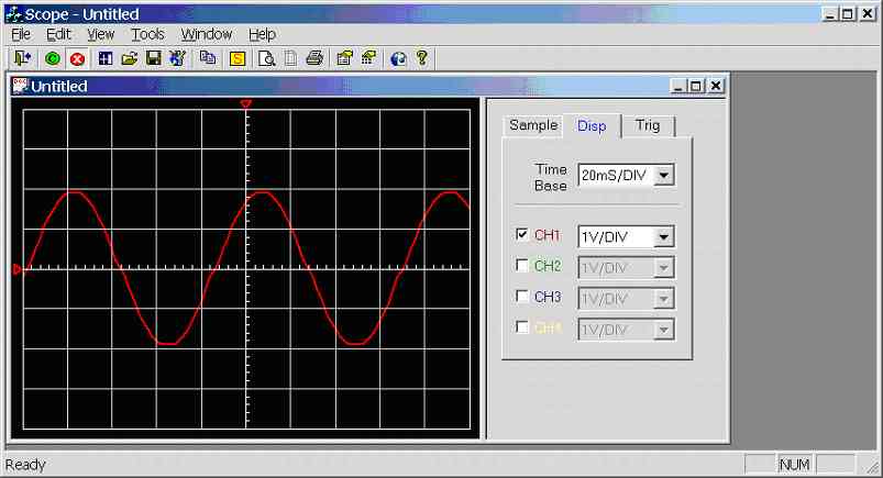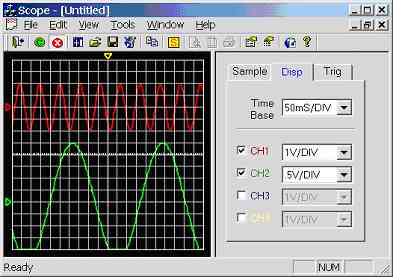 The [Disp] tab of the controls dialog can enable/disable channels simply by clicking the tick box beside each channel, change scope time-base and channel voltage scales (see figure 7.0h). Notice in figure 7.0h there are two enabled channels both of which have zero offset, hence the offset triangle for both channels are in exactly the same place (this is clear due to the colour of the triangle). This is not a problem (e.g. offset of both channels does not change if user clicks on the offset triangle) as channel 1 has absolute priority, hence only channel 1 offset will change separating the channel offsets. Note channel 2 has priority over channel 3 and channel 3 has priority over channel 4. A quick way of moving channel 4 offset for example, if all four channel are enabled and the offset of each is in the same place, is to temporarily disabled channels 1 to 3, move channel 4 offset and enable channels 1 to 3 again.