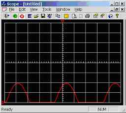 Notice the small red triangle at the top of the graphical display, this triangle shows the offset position of the displayed waveform (middle of the screen represents zero offset). The user using the mouse can click on the triangle and drag it to a new position, hence changing the waveform offset (see figure 7.0f). Notice that if the waveform is offset to the right, it is possible to see data before the waveform triggered. This feature is mainly useful for helping in the measurement of waveform period time (use in calculation of frequency) where the waveform can be scrolled so that a peak is directly in line with a division line, making actuate measurement easy.