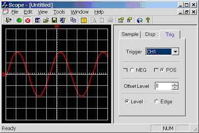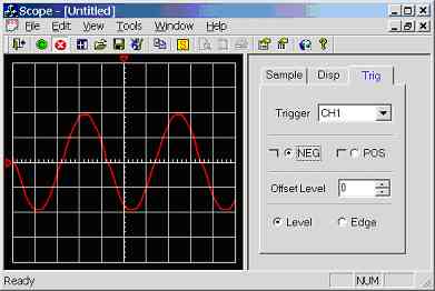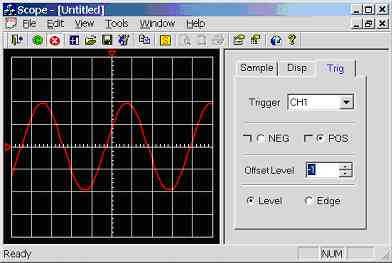 Also notice that the waveform triggers on a low to high edge (software trigger), this is user adjustable in the [Trig] tab of the controls dialog (see figure 7.0g). Notice the user has many options, level triggering means that a trigger occurs when the waveform rises from below to above the user configurable offset level for positive edged triggering and the waveform falls from above to below the user configurable offset level for negative edged triggering. Edge triggering means that the program detects the positive or negative edges of any waveform and at any voltage level, this guarantees that the waveform triggers without the need for user intervention, unlike level mode were the waveform must pass through the selected offset level.