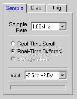 The [Sample] tab of the controls dialog sets the sample rate, mode, and input range of the scope.