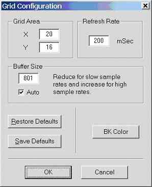 Note the lower this refresh rate (update rate) the more processor hungry the scope program becomes. A 200 milliseconds update rate will require a PC running at a minimum of 200MHz and at 50 milliseconds update rate will probably require a PC running at least 800MHz to run smoothly, depending on the selected grid resolution and type of video card in the system (hardware acceleration).