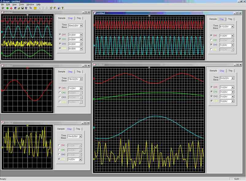 Figure 7.0k demonstrates the multiple windows feature, there are 5 views: The top left display, shows all four channels triggering on CH1 at a time-base of 50ms/DIV. The middle left display, shows CH1, with a time-base of 10ms/DIV. The bottom left display, shows CH4, with a 10ms/DIV time-base. The top right display shows CH1 and CH3 at a time-base of 0.1s/DIV. The bottom right display shows all four channels at an extremely high resolution at a time-base of 5ms/DIV and triggering off CH2. The only problem is that all scope windows have the same name “Untilled”, clearly this needs to be improved (e.g. “Untilled1”, “Untilled2”, etc…) as this is confusing to user, the reason for this is because the default automatic naming of the windows was overwritten so that filenames could be placed on the title bar. There is no limit on how many windows that can be opened simultaneously, perhaps until the computer runs out of memory, which on a modern PC could be 1000s of windows.