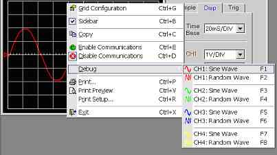 The scope program is capable of generating software waveforms (see figure 7.0n), this was used to test the graphical display and triggering methods before the simulation program and PIC hardware was ready for testing. Note this menu will be removed in the final released version.