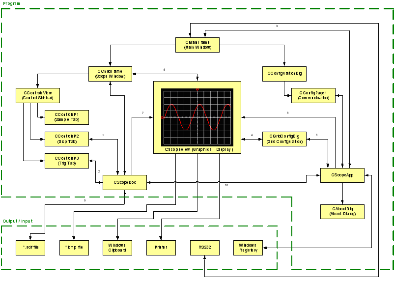 The code marked in red is the actual drawing of the waveform; basically the array is scanned and drawn to the channel DC (m_dcCH1) using the grid coordinate arrays m_nGridX[] and m_nGridY[] . The code looks more complex because of the following variables: m_nTriggerCH1 specifies the array trigger offset, m_nCH1_Offset specifies the channel offset, m_Skip specifies the number of array locations to skip to achieve the required time-base, m_MUX specifies the number of array location to duplicate to achieve the required time-base, and m_nVPD_CH1 sets the voltage scale. Note drawing of the zero point and offset arrows are also drawn in this function and all four channels are drawn in exactly the same way. This function is called by the system when the scope display is resized: -