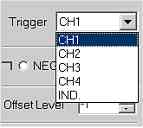 The user can select which channel to trigger off: CH1, CH2, CH3, or CH4. Notice that there is another option called “IND.”, this means independent triggering, where each channel has its one unique trigger point. It is not sure how useful this feature is as generally for dual and quad trace operation waveforms are normally related is some way and timing analysis is normally required. It was decided to include this function for increased program flexibility as this allows for four unrelated waveforms to be monitored simultaneously on the same scope display. Besides it normal practice for commercial products to have useless features (Bells and Whistles) which will probably never be used in practice, but helps give their product an edge over the competition.