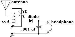 This circuit consists of an inductor (also called a coil), a variable capacitor (used to be called a variable condenser), a germanium diode (formerly called a crystal), a filtering capacitor and finally very high impedance headphones