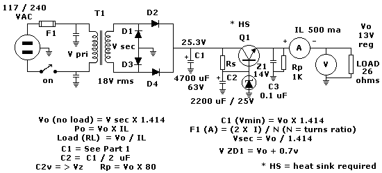 As with our previous design example in Part - 1 we had a small unregulated bench supply of 500 ma for our projects. Now we have decided that it should become a well regulated, well filtered supply giving us 13V dc.